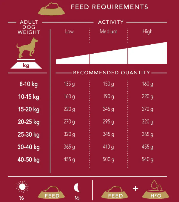 Op de achterzijde van de zak zie je een voedingstabel met links in de tabel het gewicht van je hond. In de eerste rij bovenaan zie je de activiteitsgraad van je hond. Kijk bij het gewicht van je hond en zijn activiteitsgraad, hoeveel gram je hond per dag mag eten. Die hoeveelheid verdeel je dan over 2 maaltijden. Voorbeeld: weegt je hond 23kg en is die enorm actief? Dan mag die 320gr per dag eten wat zich omzet in 2 maaltijden van telkens 160 gr.