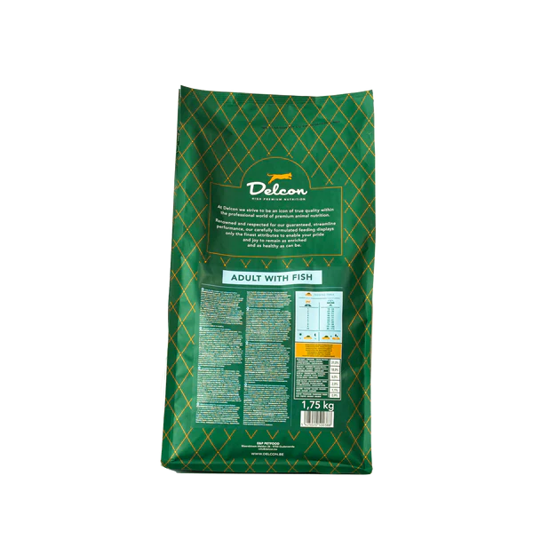 Delcon Adult with Fish is de ideale voeding voor uw volwassen kat. De hoeveelheid aanwezige zalm en zalmolie bieden een extra toevoeging voor een gezonde huid en een glanzende vacht. Dankzij de gebalanceerde samenstelling van onze kwaliteitsvolle ingrediënten krijgt deze brok een heerlijke geur en smaak.