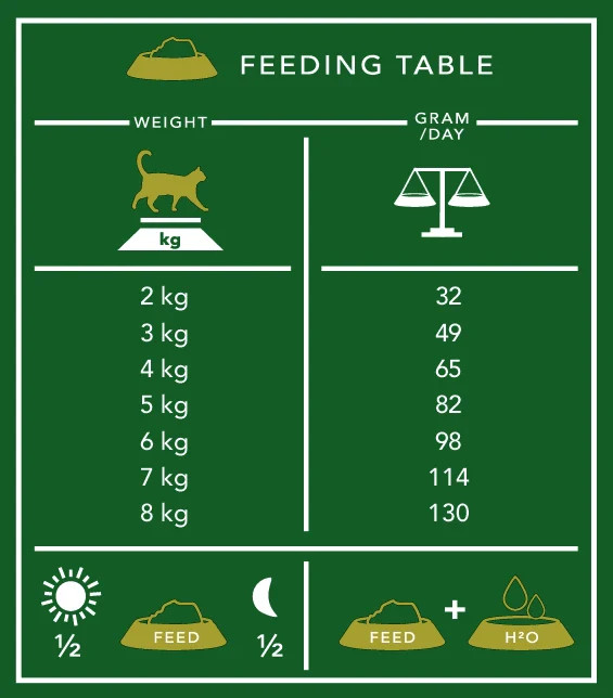In de voedingstabel (die je vindt op de achterzijde van de zak) zie je in de linkertabel het gewicht van je kat. In de kolom ernaast staat duidelijk hoeveel gram je kat PER dag mag eten. Dit gewicht mag je dan verdelen over 2 maaltijden.
