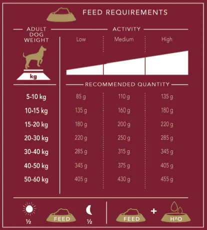 Op de achterzijde van de zak zie je een voedingstabel met links in de tabel het gewicht van je hond. In de eerste rij bovenaan zie je de activiteitsgraad van je hond. Kijk bij het gewicht van je hond en zijn activiteitsgraad, hoeveel gram je hond per dag mag eten. Die hoeveelheid verdeel je dan over 2 maaltijden. Voorbeeld: weegt je hond 25kg en is die niet echt actief? Dan mag die 220gr per dag eten wat zich omzet in 2 maaltijden van telkens 110gr.