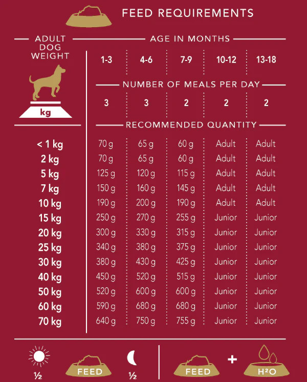 Op de achterzijde van de zak zie je een voedingstabel met links in de tabel het gewicht die je pup zal hebben op volwassen leeftijd (bv. een boxer pup weegt als volwassen hond ongeveer 25kg). Verder kijk je hoe oud je pup is op dit moment, in de rij eronder zie je hoeveel maaltijden je pup mag eten per dag. Tot hun 6 maand, verdeel je de hoeveelheid over 3 maaltijden. Later mag je overschakelen naar 2 maaltijden. Bij recommended quantity zie je hoeveel gram je pup per DAG mag eten. Deze hoeveelheid verdeel je over het aantal maaltijden je pup mag eten.