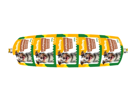 Samenstelling: lam 73%, rijst 18%, fruit 4%, groenten 4%, vitaminen en mineralen 1%. Analytische bestanddelen: ruw eiwit 10,9%, ruw vet 7,3%, ruwe as 1,1%, ruwe celstof 1,5%, vocht 68%, calcium 0,8%, fosfor 0,4%, natrium 0,4%. Nutritionele toevoegingsmiddelen/kg: vit A3a762a: 5000IE/kg, vit D3: 500IE/kg, vit E: 75mg/kg, vit K3 3a711: 0,75mg/kg, vit B1 3a821: 0,93mg/kg, vit B2 3a825i: 1,5mg/kg, vit B5 3a841: 5,44mg/kg, vit B6: 1mg/kg, vit B12: 0,015mg/kg, vit B3 3a315: 10mg/kg, foliumzuur: 0,2mg/kg, cholinechloride: 28,75mg/kg, ijzer 3b103: 25mg/kg, koper 3b405: 2,5mg/kg, zink: 3b605 50mg/kg, mangaan 3b502: 5mg/kg, jodium 3b202: 0,75mg/kg, selenium 3b801: 0,075mg/kg.