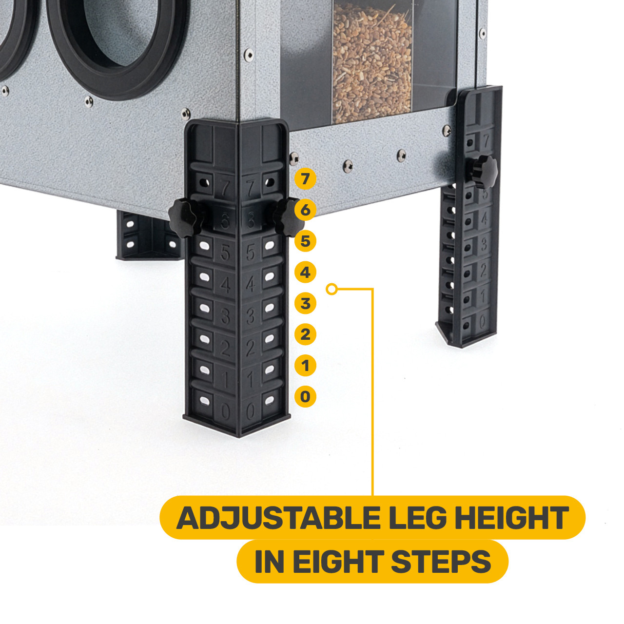 Direct zicht op het voerpeil dankzij transparante, UV-bestendige zijpanelen