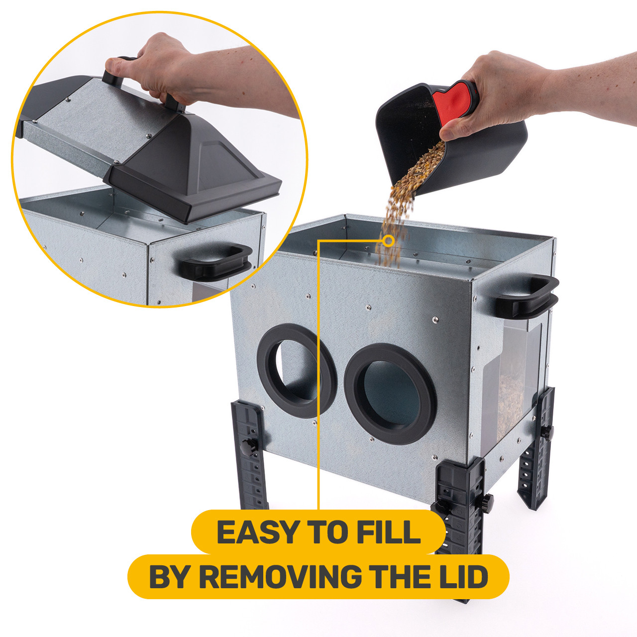 De ROBUST® metalen voerbak met voeropeningen is ontworpen voor efficiënt en hygiënisch voeren van kippen, zowel binnen als buiten. De speciaal gevormde kunststof voeropeningen beperken morsen en verminderen contact met buitenlucht, waardoor het voer langer droog blijft. Voor buitengebruik kan eenvoudig de meegeleverde rain cover worden gemonteerd.